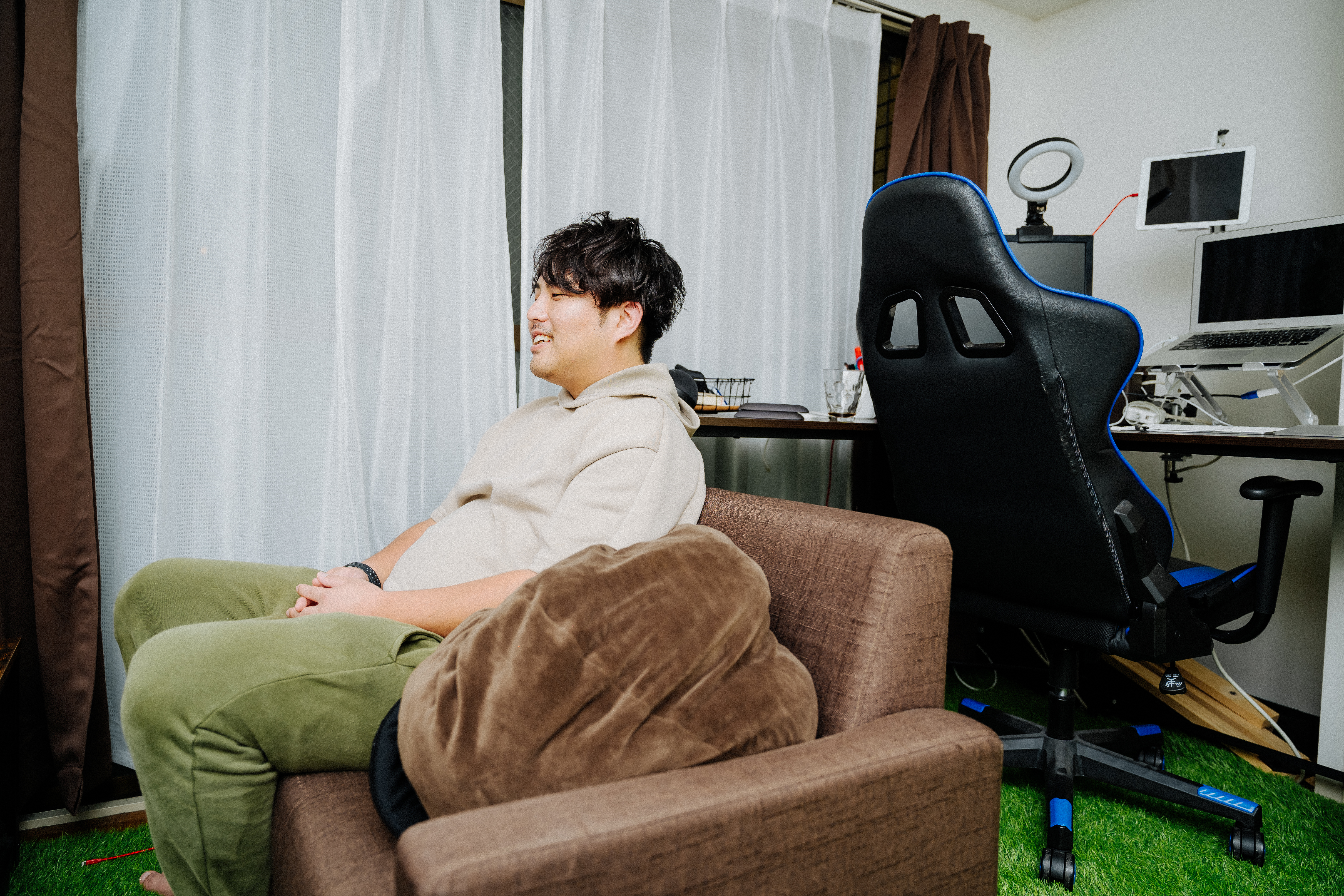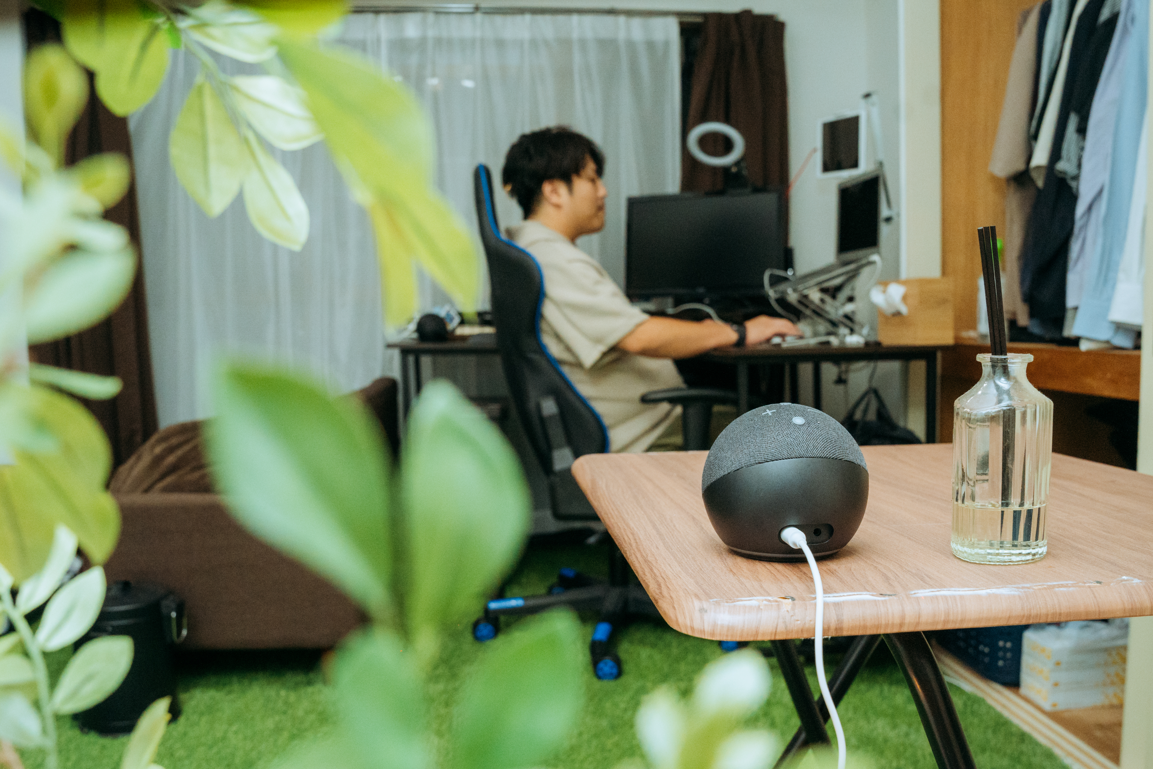 当初の目標であった家の時間を充実させるために、色々な工夫をしています。音楽は仕事してる時にテンションをあげるよう、Amazon Alexaを2台買ってマルチスピーカーにしたり。カーテンの裏にLEDつけて間接照明的な感じにしたりとかしてますね。あとは珍しいと思うのですが、床に人工芝をひいて自然を感じやすいようにしてます。